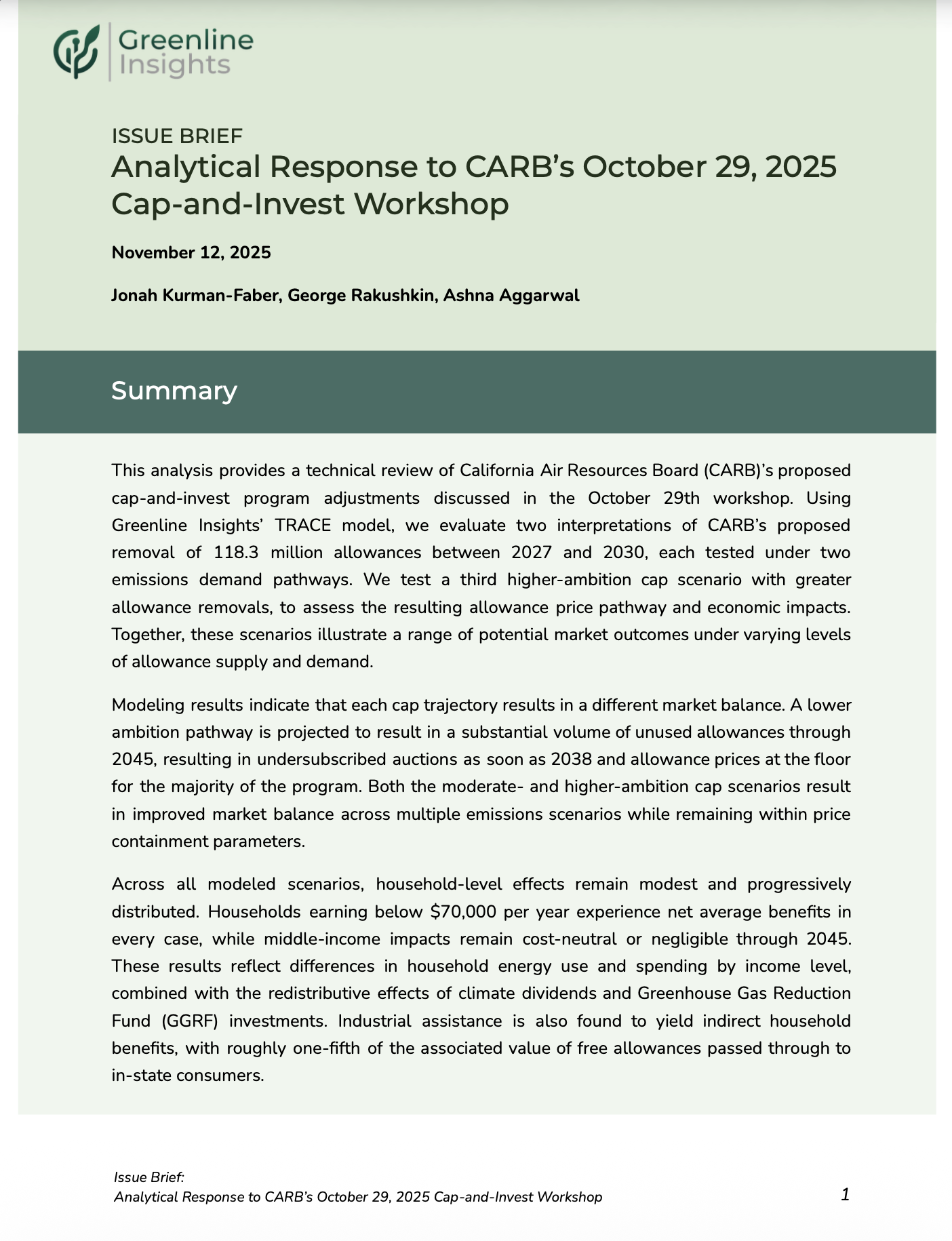 This brief provides a technical assessment of CARB’s proposed cap-and-invest adjustments presented on an October 29th, 2025 workshop. Using Greenline Insights’ TRACE model, we evaluate two interpretations of CARB’s planned removal of 118.3 million allowances from 2027-2030, along with a third higher-ambition pathway, each tested under two emissions scenarios. The results show that lower ambition leaves a large surplus of allowances and sustained price-floor outcomes, while moderate and higher ambition caps improve long-term market balance and stay within price-containment limits. Across all scenarios, household impacts remain modest and progressive, with low and moderate income households seeing net benefits on average through 2045.