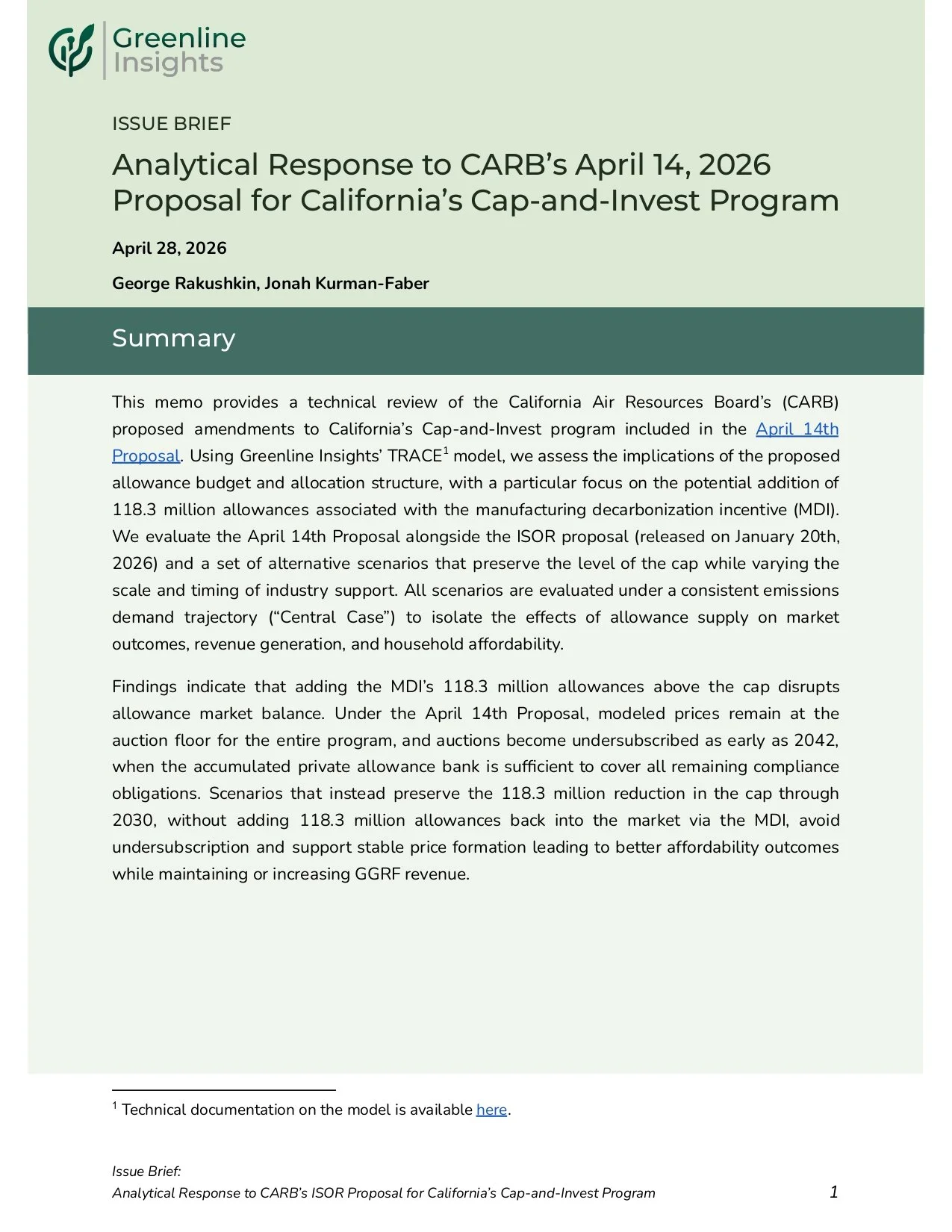 This brief provides a technical review of the California Air Resources Board’s April 14 proposal for updates to the state’s Cap-and-Invest program, with a focus on the introduction of 118.3 million allowances through the manufacturing decarbonization incentive (MDI). Using Greenline Insights’ TRACE model, the analysis compares the April 14 Proposal to the ISOR Proposal and evaluates alternative design scenarios that preserve the level of the cap while varying the scale and timing of industry support. Results show that adding allowances above the cap creates persistent oversupply, driving allowance prices to the floor, increasing the risk of undersubscription, and reducing program revenue and household affordability benefits. In contrast, scenarios that preserve the cap — by allocating MDI allowances from within the cap, reducing the total allocation, or removing the MDI entirely — avoid undersubscription, support stronger price signals, improve affordability outcomes, and maintain or increase cumulative GGRF revenue through 2045.