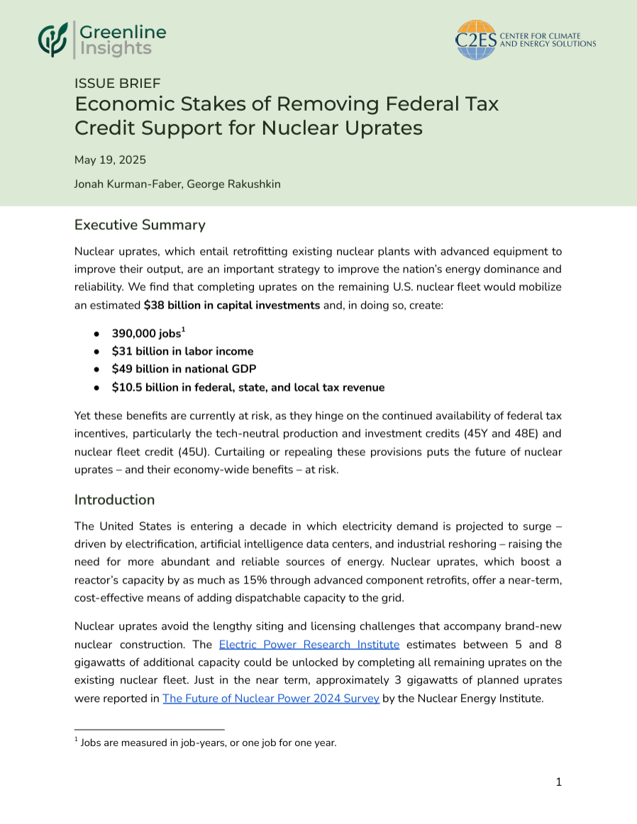 Yet these benefits are currently at risk, as they hinge on the continued availability of federal tax incentives, particularly the tech-neutral production and investment credits (45Y and 48E) and nuclear fleet credit (45U). Curtailing or repealing these provisions puts the future of nuclear uprates — and their economy-wide benefits — at risk.